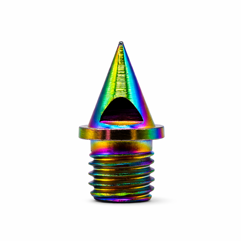 The neochrome finish produces a rainbow effect on the surface of the spike.